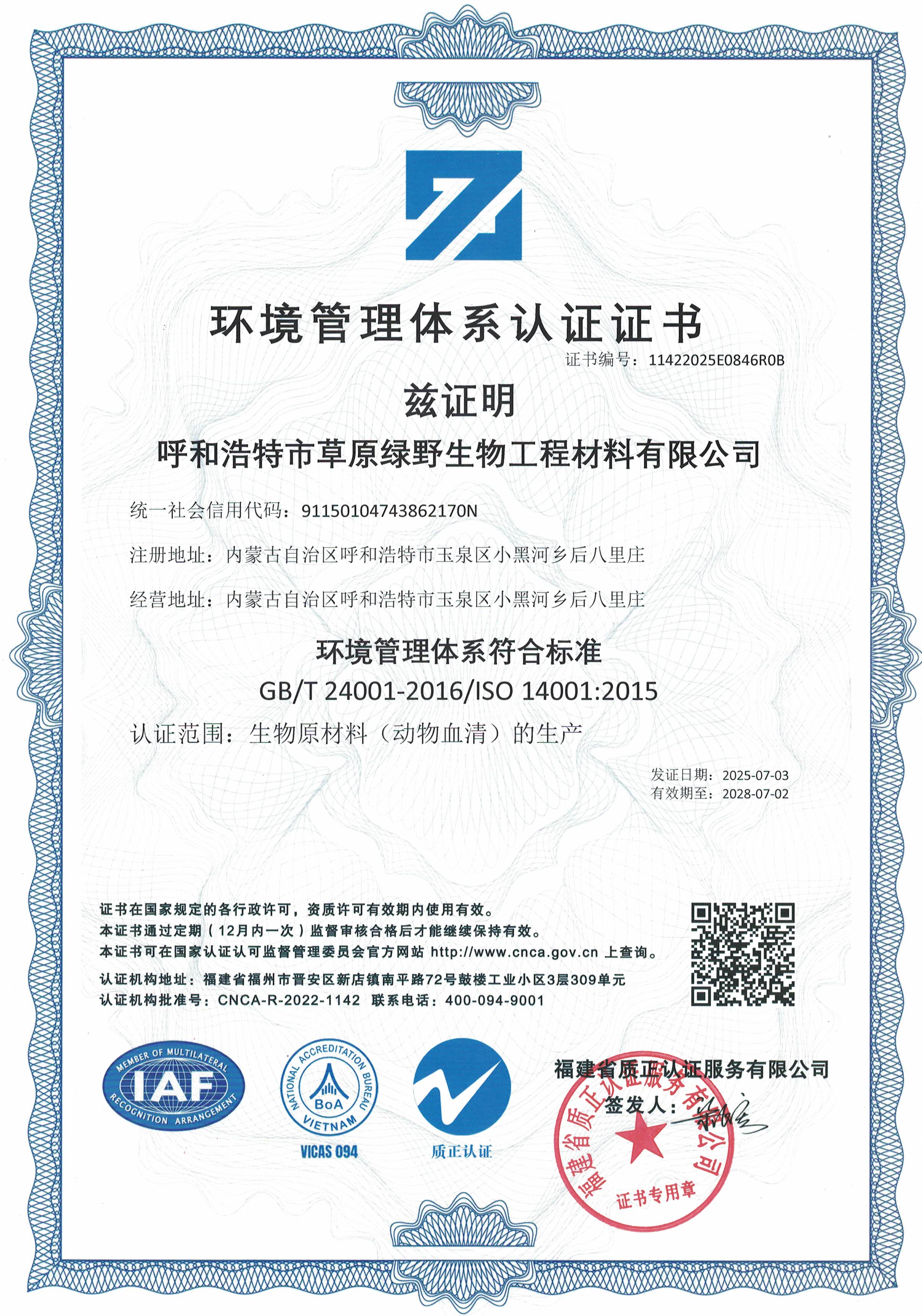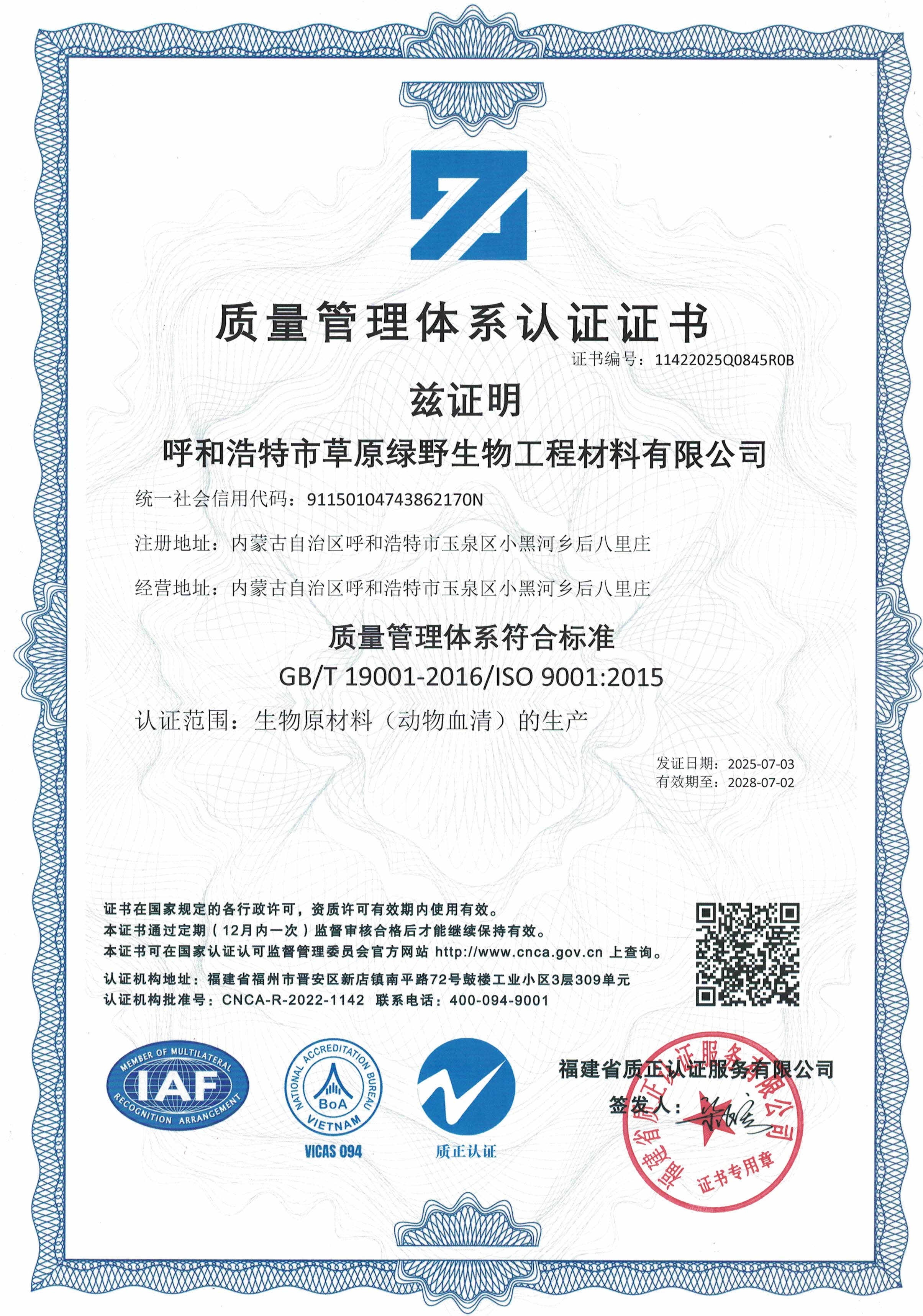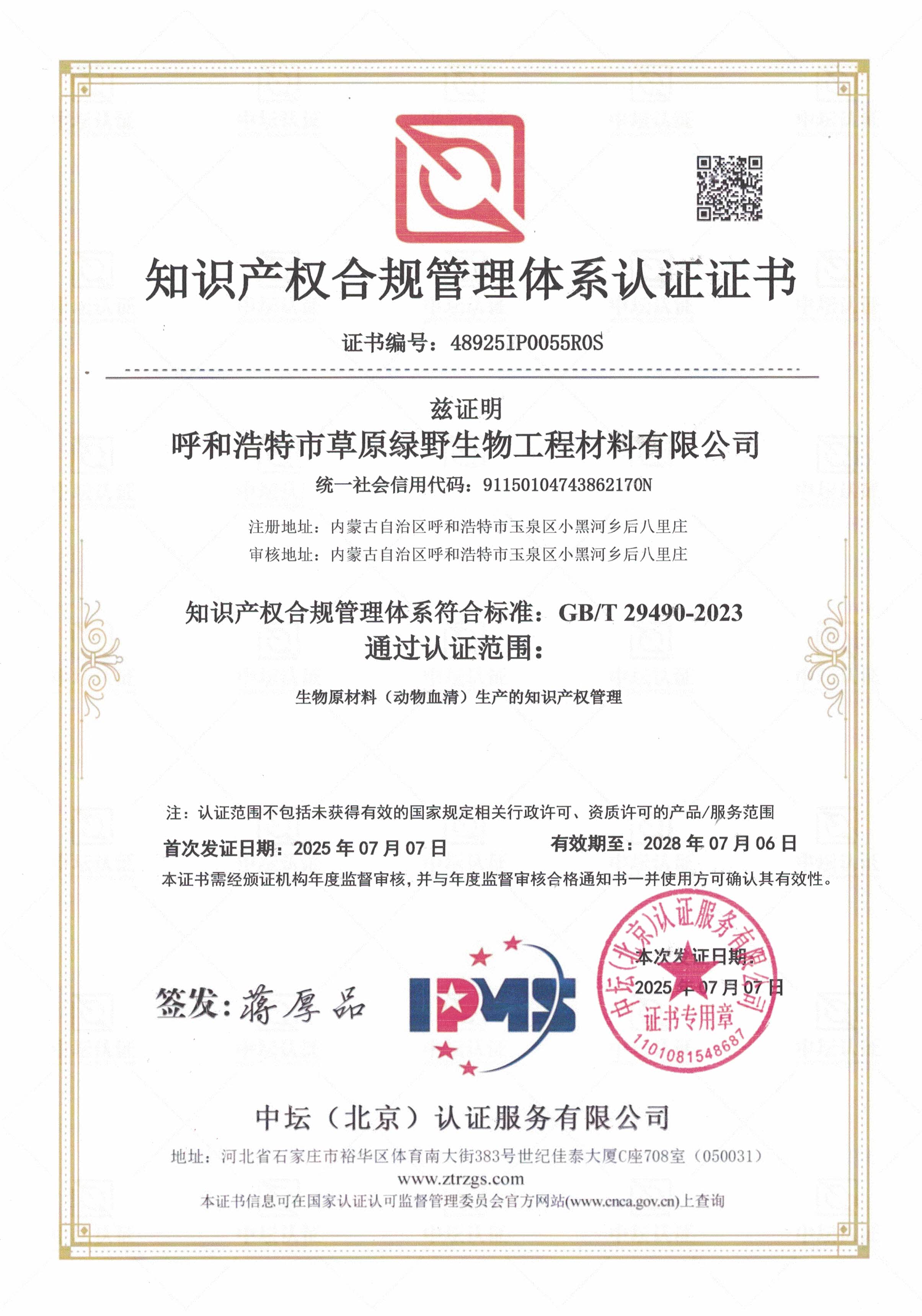 公司至今已多次通過中國醫(yī)藥生物技術(shù)協(xié)會《牛血清生產(chǎn)企業(yè)達標(biāo)》認(rèn)證、《牛血清生產(chǎn)質(zhì)量達標(biāo)企業(yè)》認(rèn)證。ISO9001質(zhì)量管理體系認(rèn)證、ISO45001職業(yè)健康安全管理體系認(rèn)證、ISO14001環(huán)境管理體系認(rèn)證、ISO13485醫(yī)療器械質(zhì)量管理體系認(rèn)證、ISO50001能源管理體系認(rèn)證、GB/T29490知識產(chǎn)權(quán)合規(guī)管理體系認(rèn)證、AAA級信用企業(yè)認(rèn)證、A級納稅單位評審等。